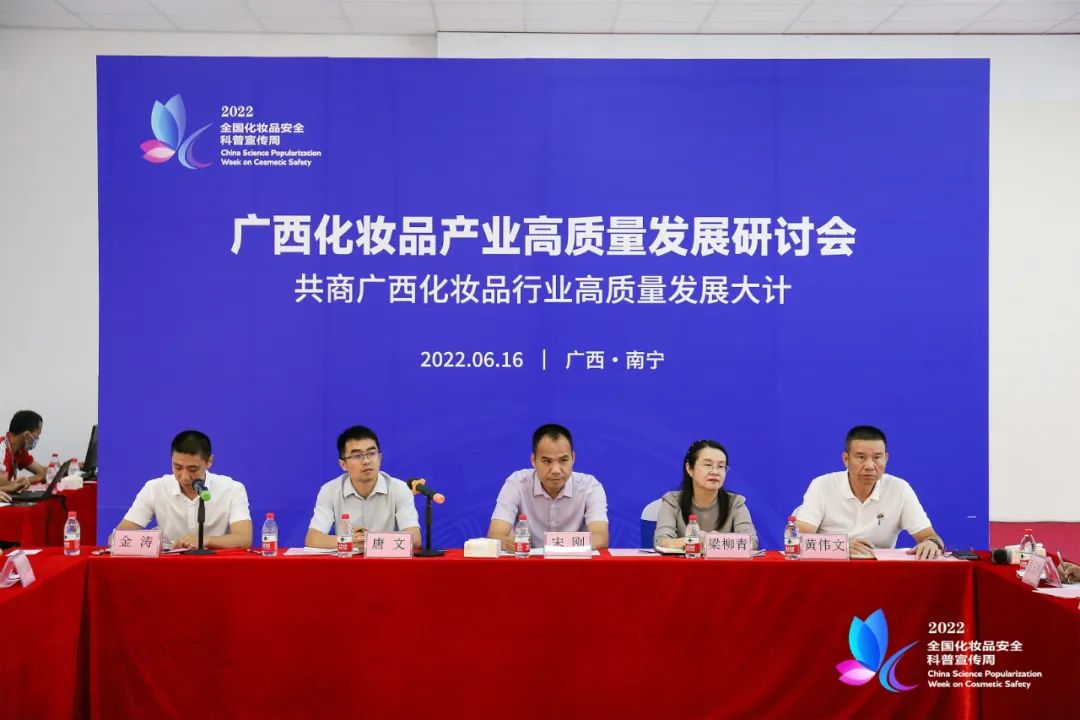 6月16日,廣西化妝品高質量發(fā)展研討會暨生產企業(yè)開放日在和桂集團舉行,作為2022年全國化妝品安全科普宣傳周廣西系列活動之一,政府高度重視,社會廣泛關注。自治區(qū)藥品監(jiān)督管理局化妝品監(jiān)管處副處長唐文,南寧市市場監(jiān)督管理局黨組成員、副局長宋剛,自治區(qū)藥品監(jiān)管局南寧檢查分局局長梁柳青,廣西化妝品協會會長、廣西和桂集團有限公司董事長黃偉文出席會議,行業(yè)專家學者、企業(yè)負責人、媒體單位,通過政府平臺公開征集的近30位公眾代表參加活動。研討會由南寧市市場監(jiān)督管理局經開分局局長金濤主持。